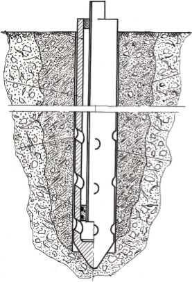 Упрочнение грунта производится путем введения в грунт затвердевающих или порозаполняющих веществ (метод тампонажа) через систему глубинных инъекторов грунтовых перфорированных с тампонажным устройством.